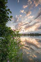 Een opname van de zonsondergang bij het Hagebergs retentiebekken / Wolfsburg. Een paar bloesems hangen aan de struik op de voorgrond en geven een mooi contrast.
