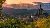 Een 16:9 foto van het beroemde kasteel van Wernigerode in warme herfstkleuren tijdens zonsondergang. Het kasteel Wernigerode was oorspronkelijk een middeleeuwse burcht in de gelijknamige Duitse stad die vooral door de Duitse keizer werd gebruikt bij zijn jachtpartijen in de Harz.