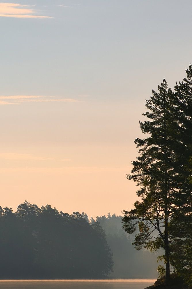 Zonsondergang op een meer in Zweden. De zon wordt weerspiegeld in het kalme water. Een bos aan de rand van het meer maakt het romantische plaatje compleet.
