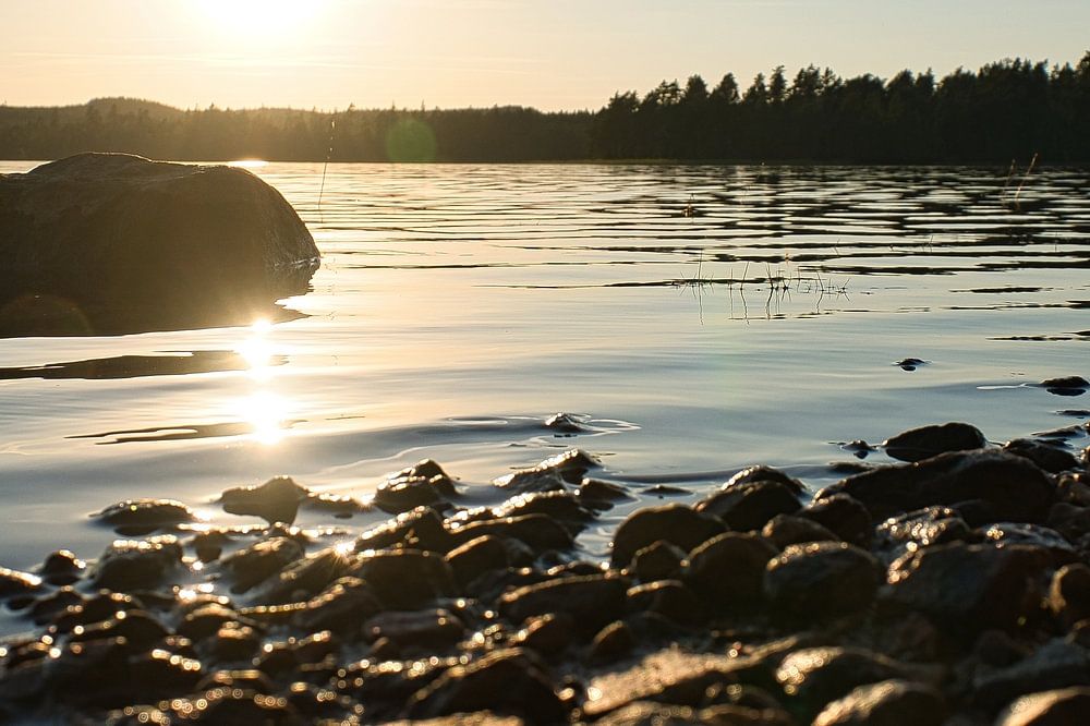 Zonsondergang op een meer in Zweden. De zon wordt weerspiegeld in het kalme water. Een bos aan de rand van het meer maakt het romantische plaatje compleet.