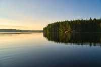 Zonsondergang op een meer in Zweden. De zon wordt weerspiegeld in het kalme water. Een bos aan de rand van het meer maakt het romantische plaatje compleet.