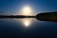 Zonsondergang op een meer in Zweden. De zon wordt weerspiegeld in het kalme water. Een bos aan de rand van het meer maakt het romantische plaatje compleet.
