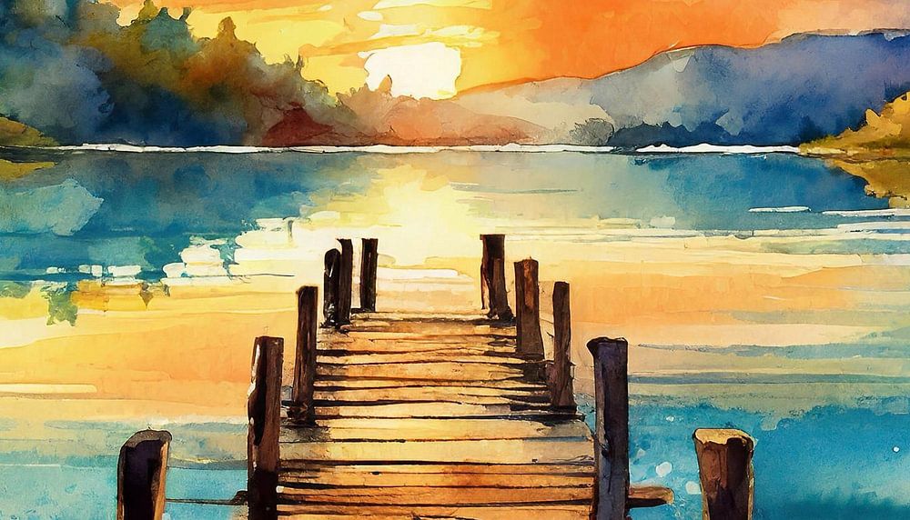 Zonsondergang bij het meer met houten steiger, kunstontwerp