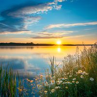 Een gouden zonnestraal kust het wateroppervlak terwijl delicate wolken dansen in de lucht. Wilde bloemen ontvouwen zich op de oever en vormen een harmonieus geheel met het rustige landschap. Dit vredige tafereel straalt een tijdloze schoonheid uit die uitnodigt om te blijven hangen en de ziel verfrist.