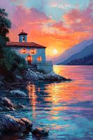 Zachte zonnestralen kussen het wateroppervlak en veranderen het in een gloeiend schilderij van goud en oranje. Het charmante gebouw aan de oever straalt rust uit, omringd door glooiende heuvels. Een vleugje mystiek waait door de lucht en nodigt je uit om te dromen, terwijl de avondlucht gehuld is in de kleuren van geluk.