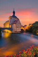 Zonsondergang bij het oude stadhuis (Altes Rathaus) in Bamberg, Beieren, Duitsland. Bamberg is een stad in Opper-Franken, aan de rivier de Regnitz, dicht bij de samenvloeiing met de rivier de Main. De stad dateert uit de 9e eeuw, toen de naam is afgeleid van het nabijgelegen kasteel Babenberch. De oude binnenstad wordt genoemd als een van de mooiste steden van Duitsland en staat sinds 1993 op de werelderfgoedlijst van UNESCO