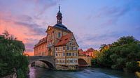 Zonsondergang bij het oude stadhuis (Altes Rathaus) in Bamberg, Beieren, Duitsland. Bamberg is een stad in Opper-Franken, aan de rivier de Regnitz, dicht bij de samenvloeiing met de rivier de Main. De stad dateert uit de 9e eeuw, toen de naam is afgeleid van het nabijgelegen kasteel Babenberch. De oude binnenstad wordt genoemd als een van de mooiste steden van Duitsland en staat sinds 1993 op de werelderfgoedlijst van UNESCO