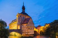 Zonsondergang bij het oude stadhuis (Altes Rathaus) in Bamberg, Beieren, Duitsland. Bamberg is een stad in Opper-Franken, aan de rivier de Regnitz, dicht bij de samenvloeiing met de rivier de Main. De stad dateert uit de 9e eeuw, toen de naam is afgeleid van het nabijgelegen kasteel Babenberch. De oude binnenstad wordt genoemd als een van de mooiste steden van Duitsland en staat sinds 1993 op de werelderfgoedlijst van UNESCO