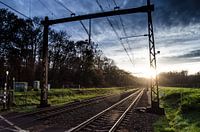 Zonsondergang bij de spoorbaan in het Orderbos in de Veluwe.