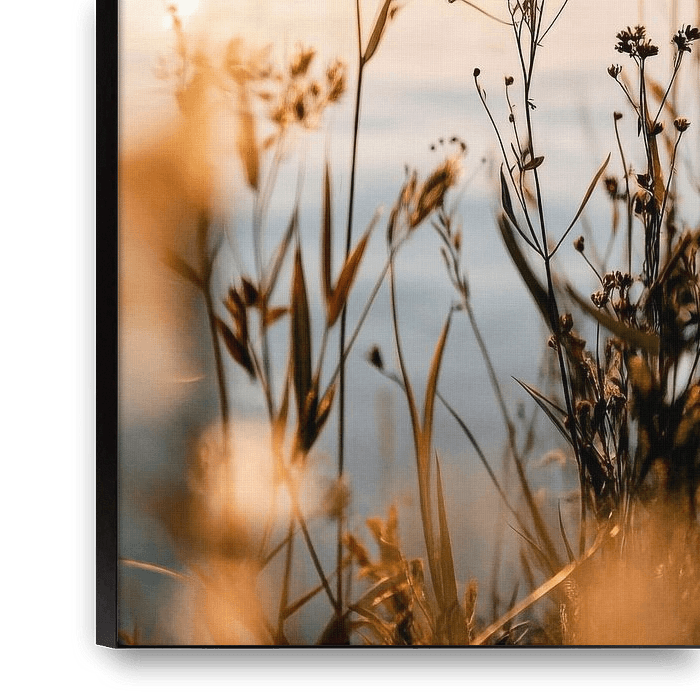 Zachte stralen van de avondzon dansen over het kalme water, terwijl tere grassen en wilde bloemen trots op de voorgrond staan. Hun silhouetten steken af tegen de gouden hemel en de geur van de natuur omhult het tafereel met een kalmerende warmte. Een perfect moment van stille harmonie tussen aarde en lucht.