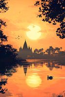Het adembenemende silhouet van een majestueuze tempel wordt weerspiegeld in het kalme water in een betoverend samenspel van gouden en oranje tinten. De zachte golven spelen rond het portret van een eenzame zwaan, terwijl de ondergaande zon een warme, uitnodigende sfeer creëert. Dit kunstwerk is ideaal voor de woonkamer en brengt een vredige en inspirerende sfeer in elke kamer.