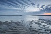 Minimalistische fotografie. Zandstructuren op de voorgrond, wolkenstructuren in de lucht bij opkomend water na ondergaan van de zon. Beweging van de wolken vastgelegd door een lange sluitertijd.
