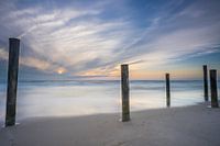 Deze foto heb ik gemaakt tijdens onze vakantie in Noord-Holland. Wat een prachtige zonsondergang bij de zee en het strand in Petten. Er zitten prachtige tinten in de lucht. Het wordt al behoorlijk vloed, de palen op het strand staan al in het water.