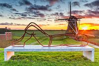 Zonsondergang bij molen de De Goliath gelegen nabij de Eemshaven in de gemeente Eemsmond. Op de dijk in de voorgrond staat een bankje met een gietijzeren sculptuur van een op zijn rug liggende man. dat dienst doet als rugleuning. Nederlands landschap. Hollands landschap. Deze foto is gemaakt in de Winter van 2017.