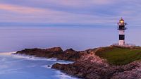 Een 16:9 foto van een zonsondergang bij de vuurtoren "Faro Illa Pancha", gelegen en gesitueerd op het eiland Pancha nabij de stad Ribadeo in Galicië, een van de zeventien autonome regio's van Spanje gelegen in het uiterste noordwesten van het Iberisch Schiereiland.