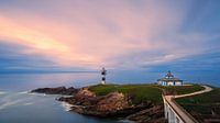 Een 16:9 foto van een zonsondergang bij de vuurtoren "Faro Illa Pancha", gelegen en gesitueerd op het eiland Pancha nabij de stad Ribadeo in Galicië, een van de zeventien autonome regio's van Spanje gelegen in het uiterste noordwesten van het Iberisch Schiereiland.