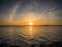 Laag bij het water genomen foto, met op de achtergrond de ondergaande zon, bij kabbelend water.