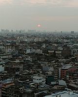 Deze sfeervolle stadsfoto neemt je mee naar het hart van Bangkok, gevangen tijdens een sereen moment van zonsondergang. Een zachte nevel hangt boven de stad, waardoor de kleuren in de lucht worden gedempt tot een palet van grijsblauw, pastelroze en oranje. De zon hangt laag aan de horizon als een oranje bol, half verscholen achter de contouren van de verre skyline. Op de voorgrond zie je een wirwar van daken, verweerde gebouwen en smalle straatjes, een chaotisch maar karaktervol patroon dat typisch is voor de Thaise hoofdstad.