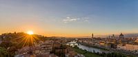 Panorama van Florence tijdens zonsondergang, waarbij nog een klein deel van de zon te zien is, vanaf het monument van Michelangelo, waardoor duidelijk is hoe de rijke stad, bekend van de vele kunstenaars, gelegen is tussen de toscaanse heuvels.