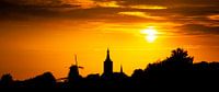 De zon zakt langzaam onder boven Hasselt, nog zichtbaar zijn de grote Stephanus kerk, de molen en de brug.