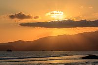 De zon zakt snel weg achter de wolken en bergen rondom Padangbai, in het oosten van Bali, Indonesie. Ik verbleef in een hotel aan de andere kant van de baai, in Candidasa. De zonsondergangen die ik gezien heb waren niet allemaal even fraai: vaak werd het rond die tijd wat heiig en hing er lage bewolking rondom de bergen. De zon was dus al verdwenen voordat hij ging kleuren. Deze keer was het helder en werd het een fraaie Bali sunset.