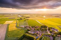 Een luchtfoto van het plaatsje Schouwerzijl aan het Reitdiep in de provincie Groningen. De ondergaande zon komt nog net even onder een aankomende onweerswolk tevoorschijn.