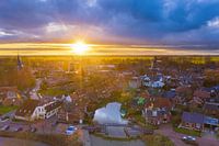 Uitzicht op het dorp Winsum in Groningen tijdens zonsondergang. Uiterst links is de Torenkerk van Winsum nog zichtbaar en verder naar het midden de molens De Vriendschap en De Ster. Op de voorgrond het Winsumerdiep met rechts daarvan Obergum, het noordelijk gedeelte van het dorp.