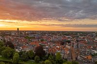 Kleurrijke zonsondergang over de stad Zwolle met de Sassenpoort op de voorgrond tijdens een mooie zomeravond. De zon gaat onder in de verte terwijl de lucht oranje kleurt.
