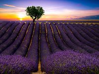 Een mooie zonsondergang boven een prachtig lavendelveld in Frankrijk in de Provence.