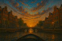 Een betoverende zonsondergang werpt warme tinten over de iconische grachtenpanden van Amsterdam, gezien vanuit een roeiboot. De reflectie in het water en het spel van licht en schaduw geven dit tafereel een dromerige, bijna schilderachtige sfeer.
