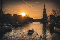 Op een mooie zomeravond gaat de zon mooi onder achter de Amsterdamse huizen. De zon kleurt de lucht mooi geel oranje. Tijdens de zonsondergang vaart er nog een bootje over de Amsterdamse grachten wat het tot een mooi geheel maakt.
