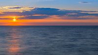 Een 16:9 foto van een avond met warme en sfeervolle kleurtinten tijdens een romantische zonsondergang boven de Atlantische Oceaan, gezien vanuit het stadje Etretat (departement Seine-Maritime), in Normandië, Frankrijk.