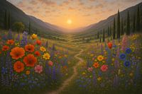 Laat je meevoeren door de warme omhelzing van een bloemenweide badend in de laatste zonnestralen. In het hart van deze betoverende compositie zakt de zon langzaam achter de heuvels, terwijl haar gouden licht een zacht stralende sluier legt over een vallei vol kleur. Een kronkelend pad slingert zich door het landschap en nodigt uit tot dwalen, dromen en vertragen.