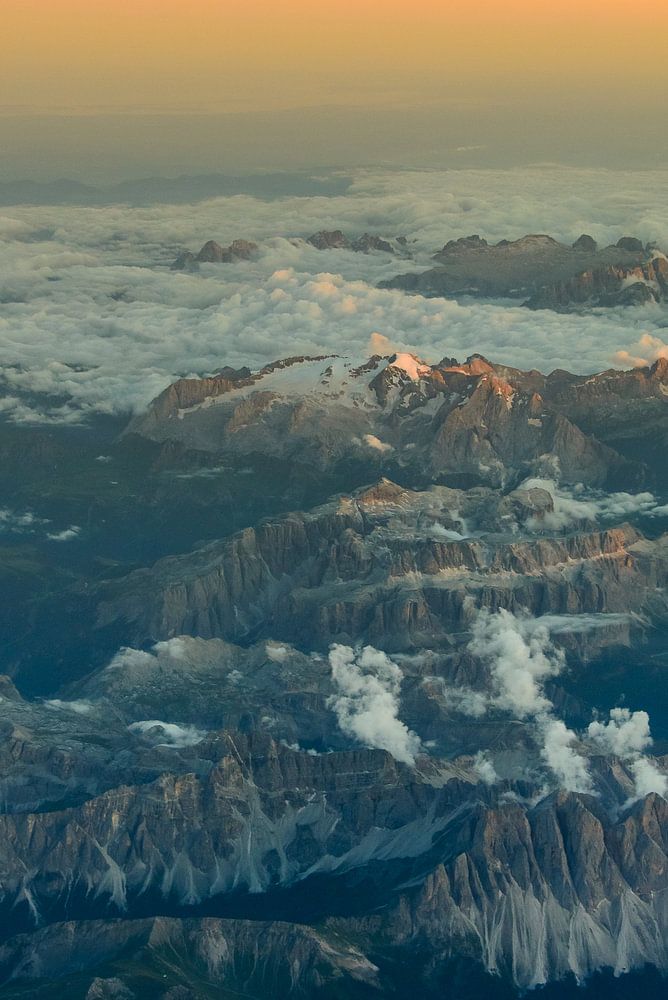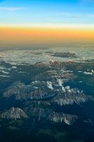Luchtfoto bij zonsondergang over de Dolomieten, Veneto, Italië