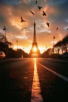 De foto toont de iconische Eiffeltoren, majestueus tegen een gloedvolle zonsondergang die de lucht verlicht in warme gouden tinten. Vogels vliegen over het tafereel en geven het moment een levendige dynamiek. De lege straat trekt het oog direct naar het monument en creëert een kalme maar betoverende sfeer.