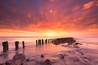 Een spectaculaire en dramatische rode zonsondergang boven de Waddenzee bij eb met een strekdam en stenen in de voorgrond. De foto is genomen op een mooie zomeravond.