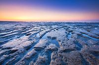 Zonsondergang boven de Waddenzee bij eb. Er hangt een prachtige gloed in de lucht met mooie kleuren die reflecteren op de mudflats.