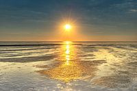 Zonsondergang boven Het Wad bij laagwater met de reflecterende zon in het slik vanaf de dijk bij het Friese dorpje Koehoal