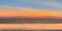 Zonsondergang boven de Waddenzee nabij Koehoal op het moment dat de zon verdwijnt. De kleurenschakering wordt gespiegeld op het stille water van het Wad.