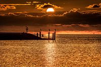 Zonsondergang boven de haven en pier van het Friese havenstadje Harlingen waarin water en lucht oranje gekleurd zijn.