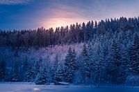 Zonsondergang over een sfeervol koud sneeuwlandschap met door lichte sneeuwval bedekte bosbomen die schitteren onder een bewolkte hemel boven de bergtop