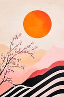 Een stralende zonsondergang gloeit in warme oranje tinten over glooiende heuvels, terwijl delicate kersenbloesems een vleugje gratie toevoegen. Het harmonieuze kleurenpalet en de gestileerde vormen brengen rust en inspiratie in elke kamer. Perfect voor de slaapkamer, waar dromerige nachten en zachte gedachten kunnen ontstaan.