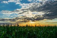Een kleurrijke zonsondergang boven een korenveld met rode, gele en blauwe tinten op het gouden uur tijdens zonsondergang, in een landelijke omgeving.
