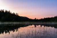 Een geweldige zonsondergang op een windstille avond over een meer in Jämtland, Zweden.