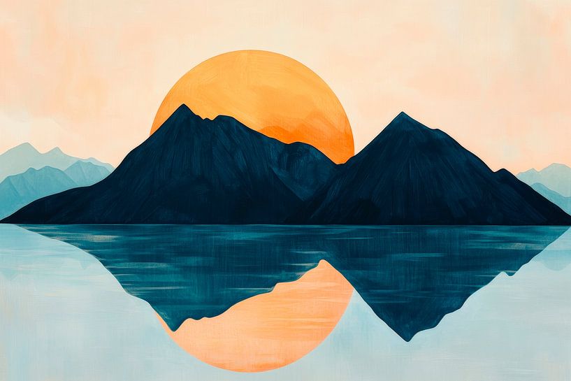 Een feloranje zonsondergang verspreidt zijn warme stralen over de zachte, schaduwrijke bergen, waarvan de weerspiegeling kalm in het water rust. Dit harmonieuze samenspel van kleuren en vormen geeft elke ruimte een rustgevende sfeer, perfect voor de woonkamer, waar ontspanning en inspiratie worden gecombineerd.