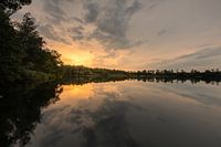 Foto van een visplas Sassenhein Zuidplas bij Haren in Groningen. Het water is rustig, er staat weinig wind. De zonsondergang, wolken en begroeiing weerspiegelen in het water.