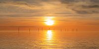 Zonsondergang boven het IJsselmeer nabij Molkwerum, Friesland, met een reiger bovenop een fuikenpaal in het midden van de lichtbaan.