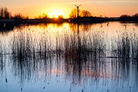 Zonsondergang boven het Lauwersmeer in de provincie Groningen. Aan de horizon een silhouet van een windmolen. Deze foto is gemaakt aan de rand van hetrecreatiegebied Suyderoogh.