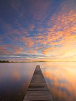 Een steiger op de voorgrond geeft diepte aan de foto en de warme kleuren van de zonsondergang contrasteren mooi tenen de koele blauwe tinten van de avond.