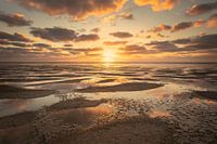 Aan de kust van Friesland, bij Koehool, ontvouwt zich een betoverend schouwspel tijdens zonsondergang. De zon zakt langzaam achter de horizon en kleurt de lucht in warme tinten van goud en oranje, terwijl de wolken erboven een zacht contrast vormen met hun donkere silhouetten. Op de voorgrond liggen de slikken van het Wad, waar het water in kleine plassen is achtergebleven na het aflopende tij. Deze plassen spiegelen het licht van de ondergaande zon en creëren een prachtig patroon van glans en schaduw dat zich uitstrekt naar de einder.